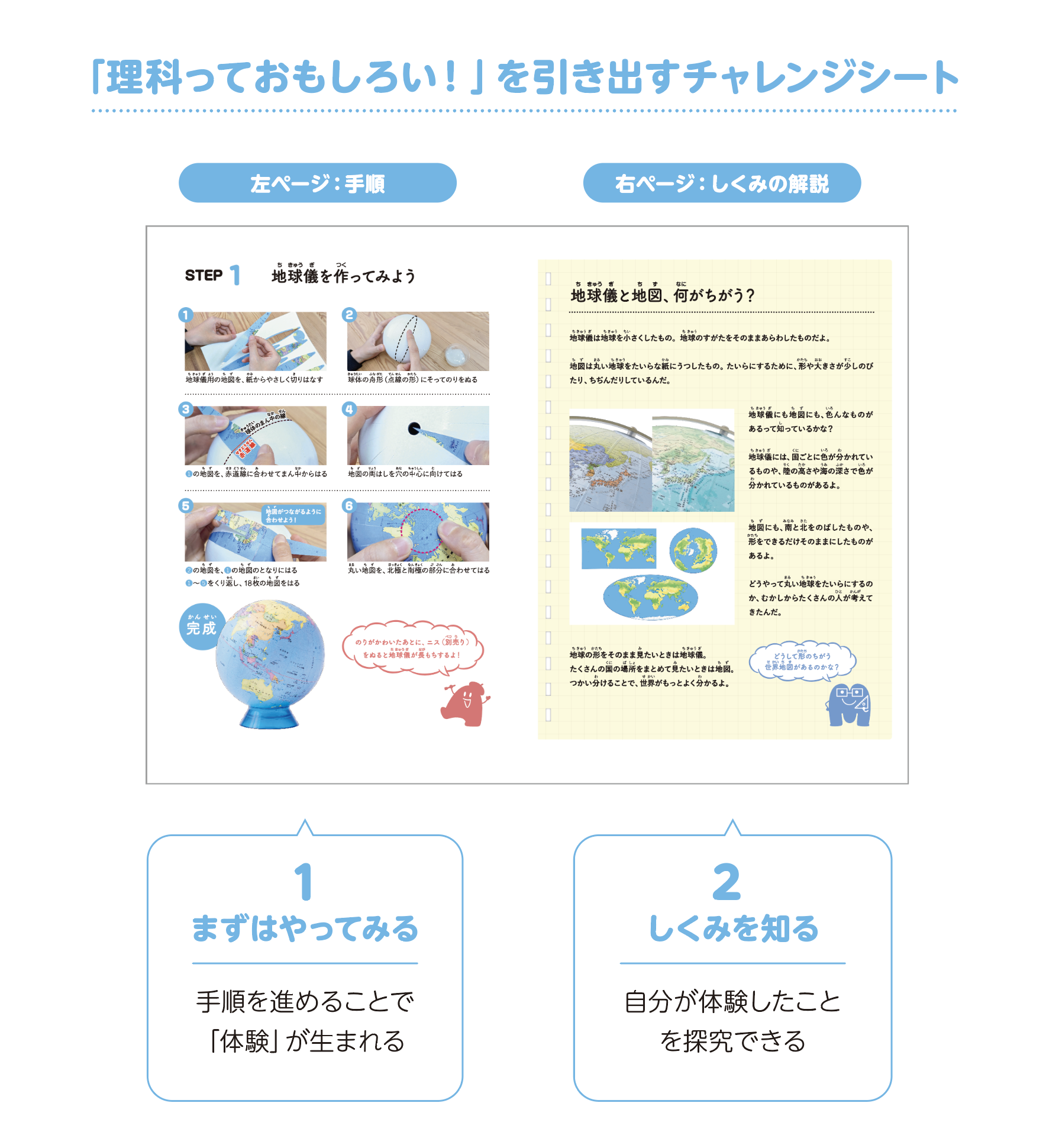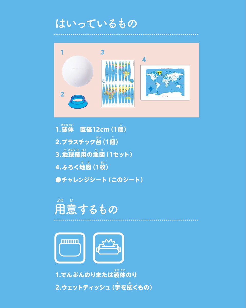 セット内容:球体(直径12cm)、プラスチック台、地球儀用の地図、ふろく地図、チャレンジシート