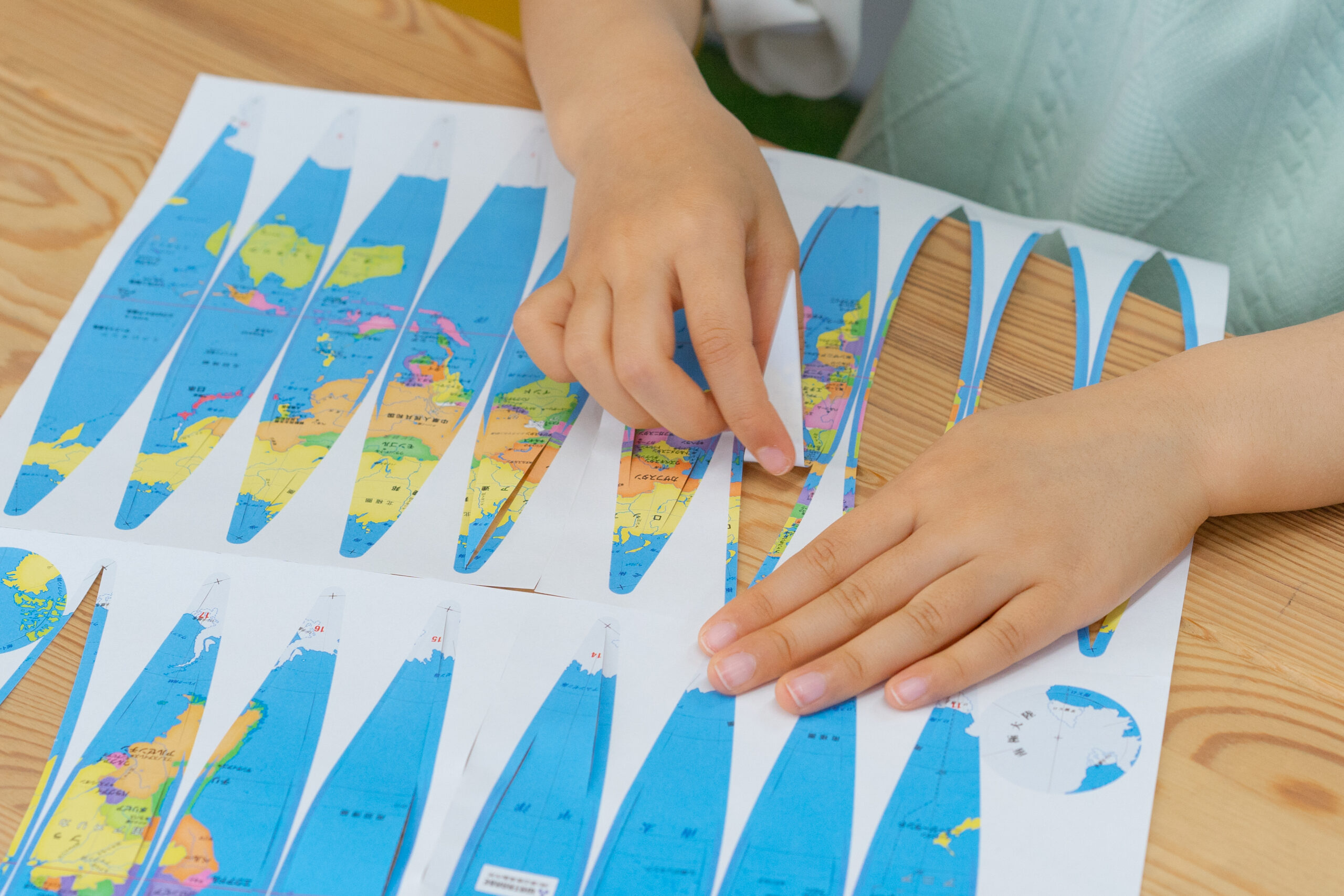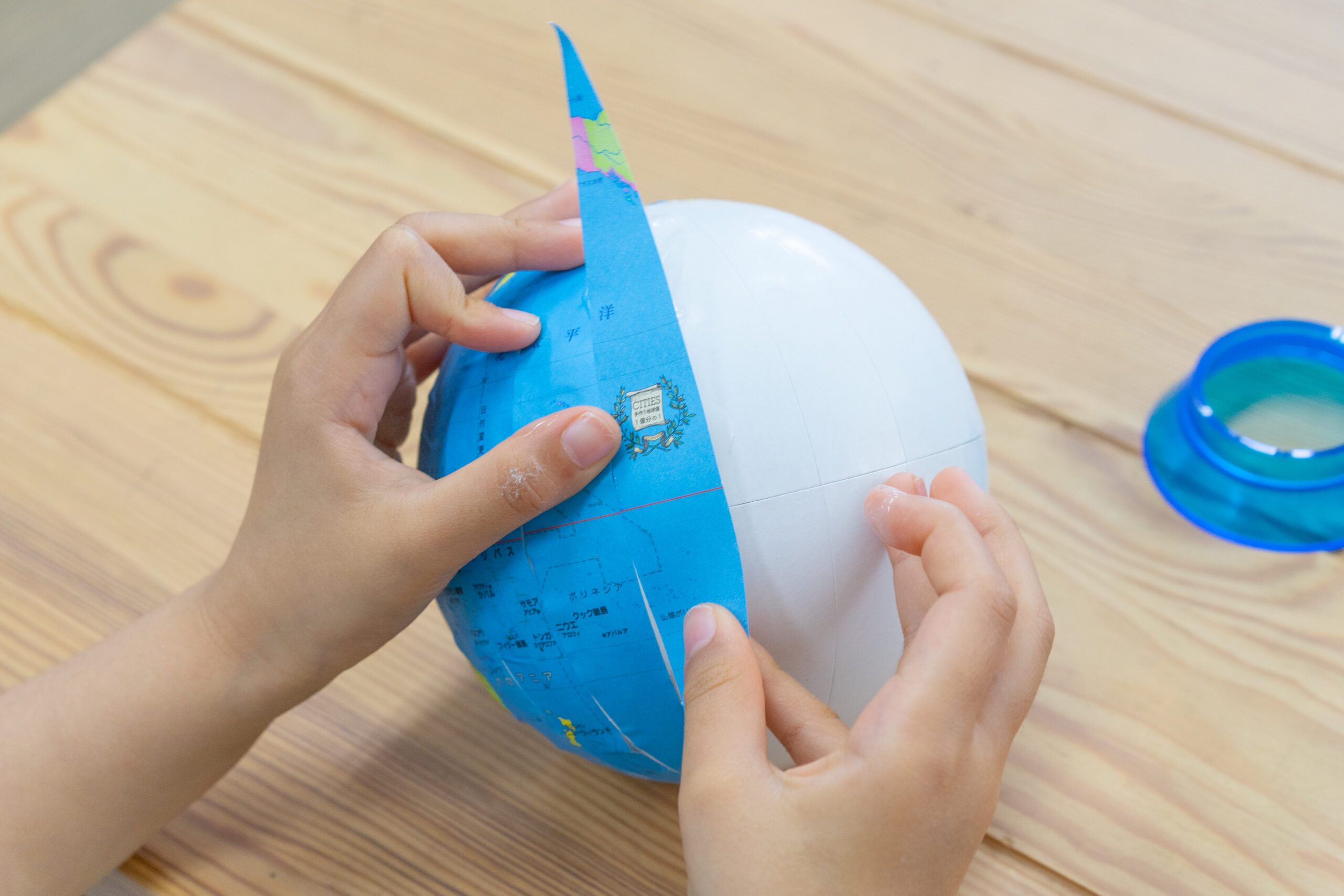 白い球に地図を貼り、地図が地球になるしくみを学びながら、